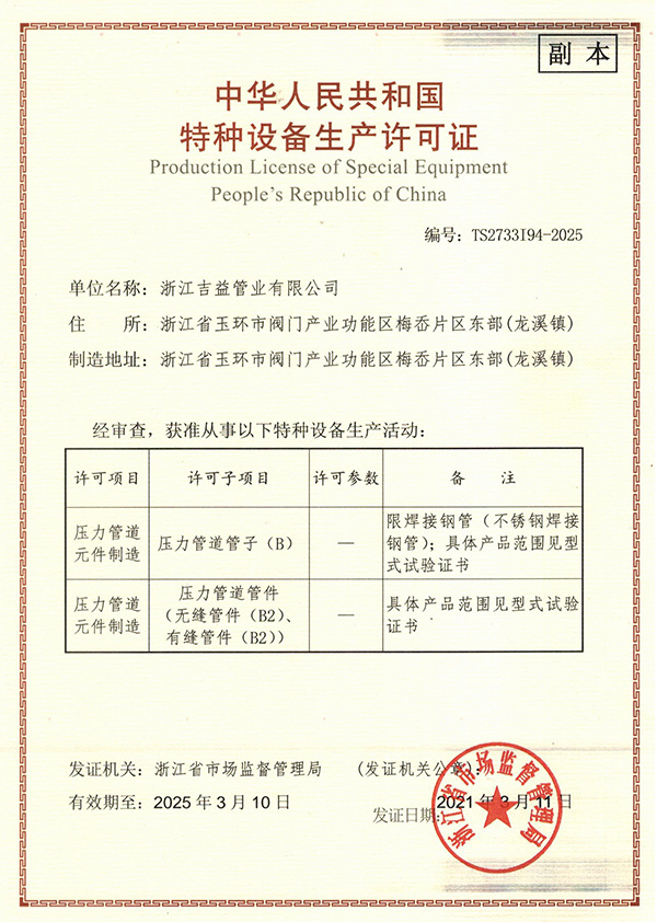 浙江吉益管业有限公司成立于2012年,注册资金3000万元,公司生产基地占地面积为1.6万平方米,是一家集科研、生产和销售于一体的专业不锈钢管道制造企业。公司采用精密铸造工艺生产SUS304、SUS316材质的各种不锈钢管件,卡压式管件,薄壁不锈钢管,沟槽管件,沟槽卡箍,卡压工具,不锈钢接头,弯头,法兰,三通,卡压式接头,弯头,法兰,三通等各种管道配件。同时,开发生产的德标单卡压系列以及国标双卡压系列深受国内外市场的青睐。
